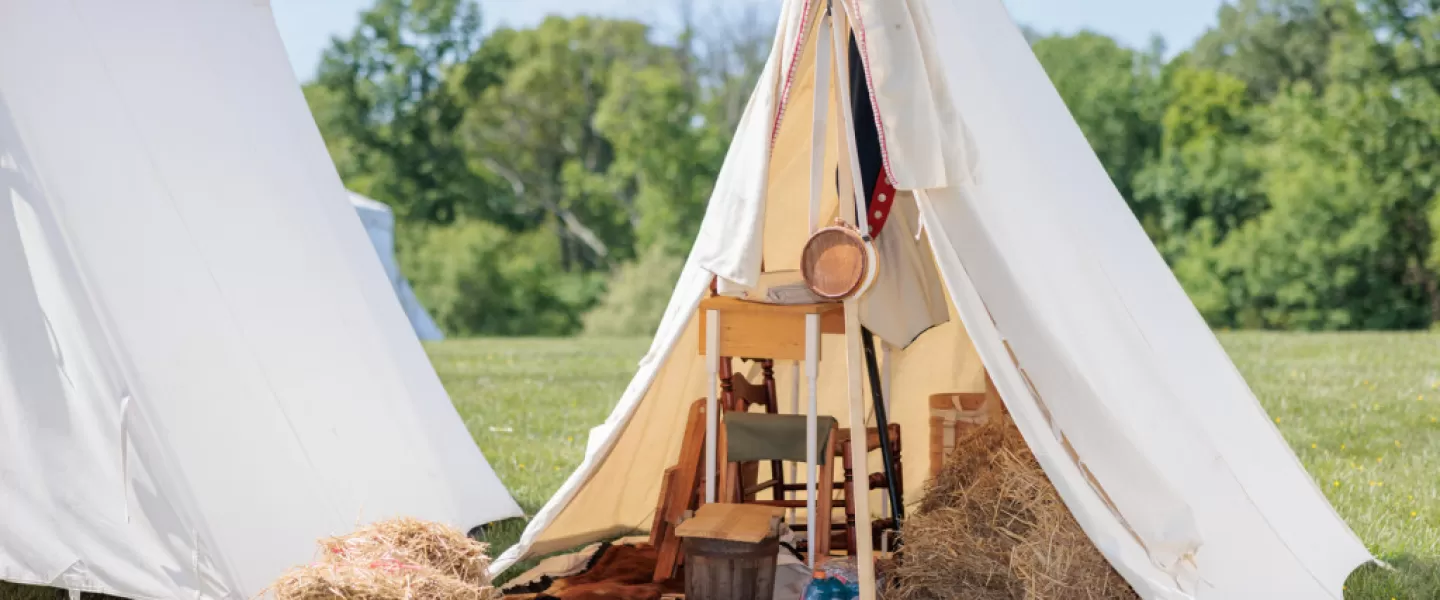 Immerse yourself in the daily life of soldiers, military officers, and the camp followers who traveled with the army as you explore a Revolutionary War encampment. At this hands-on attraction, you can touch the items inside the soldiers' tents and officer's tent, wash clothes in the laundry yard, and examine cooking utensils used by camp followers.