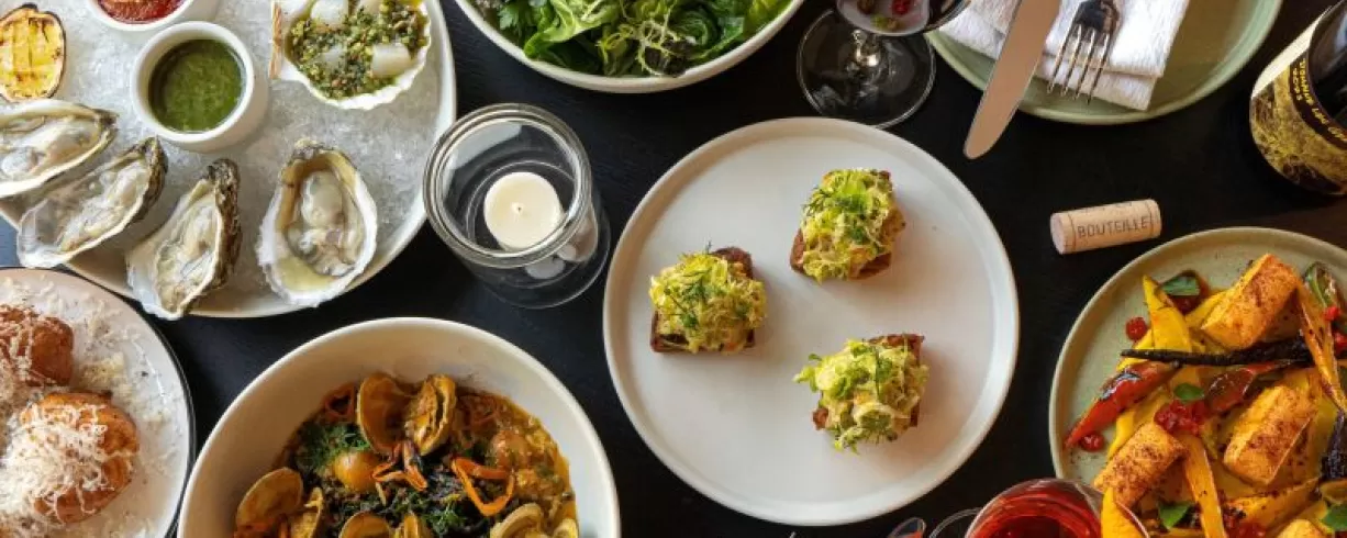 Dine at a.kitchen+bar, by James Beard Award winner Ellen Yin, featuring hyper-seasonal American small plates and an acclaimed natural wine program.