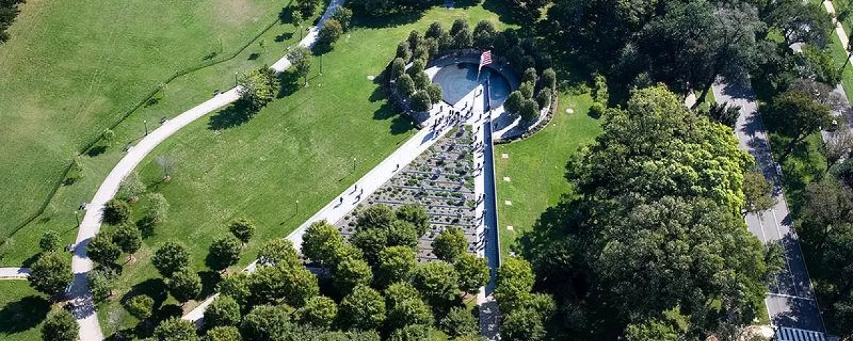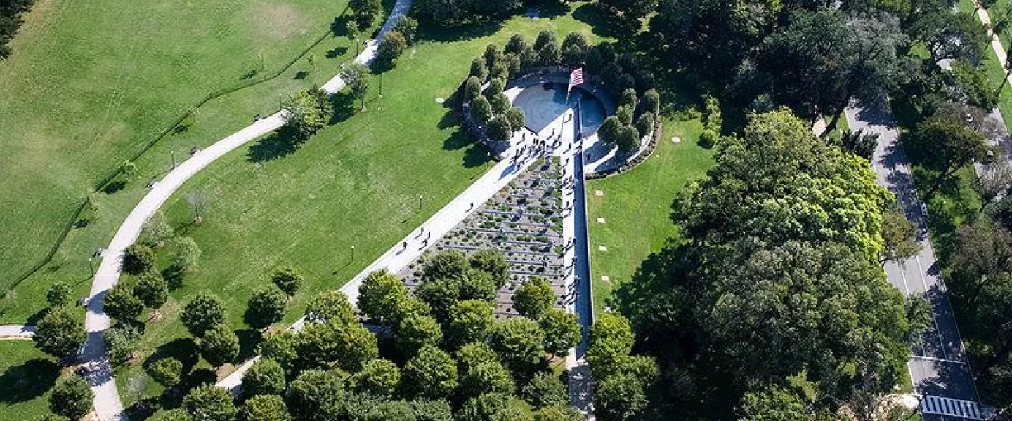 The Korean War Veterans Memorial consists of multiple structures that honor those who sacrificed during the three-year conflict that was the Korean War. The memorial’s mural wall measures 164 feet long and eight inches thick, and from a bird’s eye view, the wall appears as an isosceles triangle, with the tip intersecting a circle over the Pool of Remembrance. It resides on the National Mall, southeast of the Lincoln Memorial and just south of the Reflecting Pool. All of its components, including its walls, stainless steel statues and Pool of Remembrance, are dedicated to the U.S. Armed Forces that served and sacrificed during the Korean War. The memorial is free and open to the public 24 hours a day, with rangers on duty to answer questions from 9:30 a.m.-10 p.m. daily. Interpretive programs are provided throughout the day and upon request.