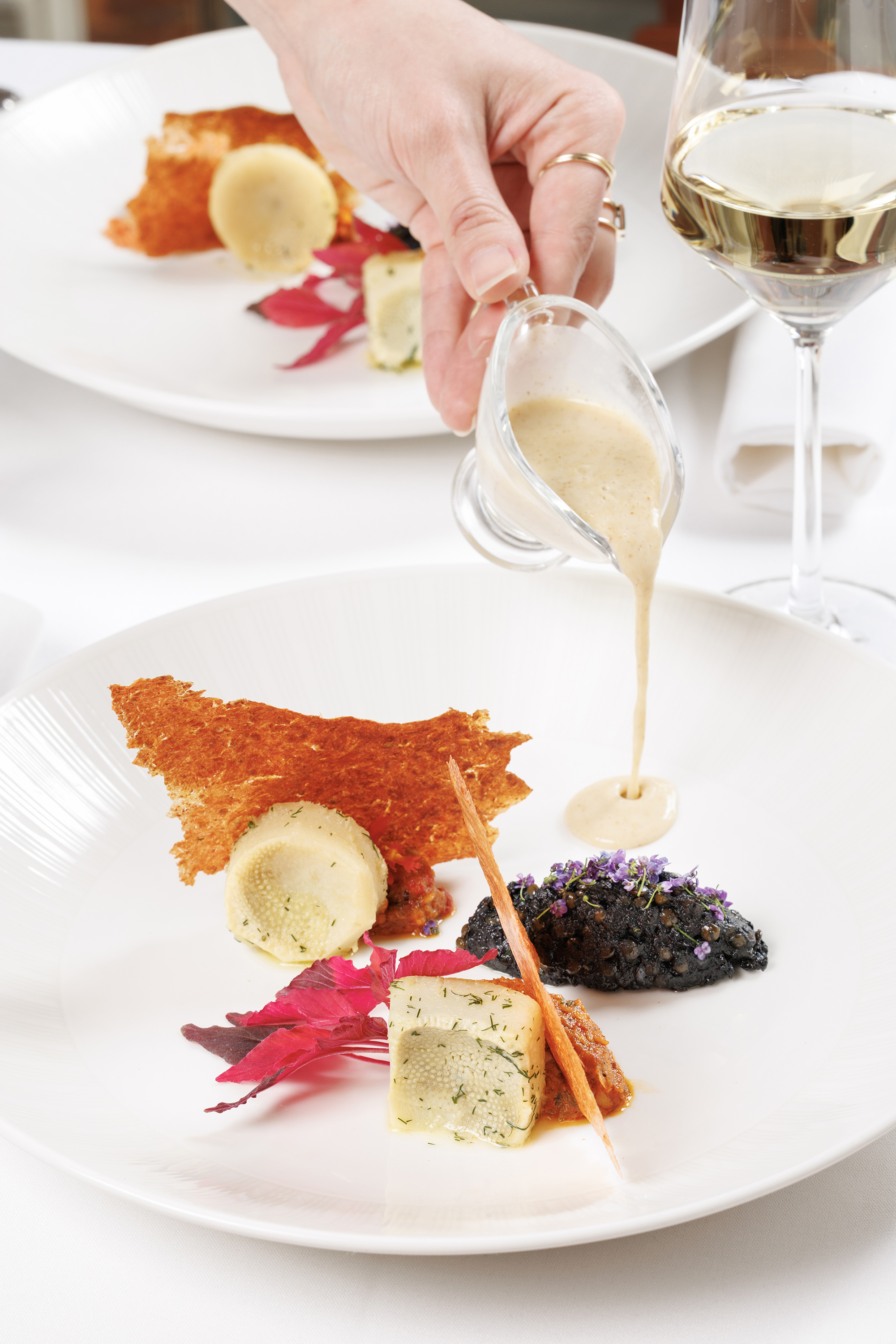 We provide full-service catering, a built-in Onyx Bar, elevator access, two private restrooms, real silver, A/V capabilities, and a professionally trained fine dining service team. Our on-premise sommelier and bartender create bespoke pairings and custom cocktails, and menus can be tailored to suit dietary needs and event goals.